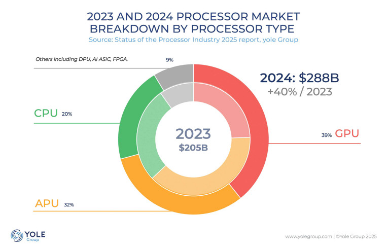W 2024 roku układy GPU (Graphic Processing Unit) stały się wiodącym segmentem procesorów, wyprzedzając APU (Application Processing Unit) i CPU (Central Processing Unit). Przy przychodach w wysokości 113 mld dolarów, procesory graficzne stanowiły 39% całkowitej sprzedaży procesorów, napędzane bezprecedensowym wzrostem o 126% w ciągu zaledwie jednego roku. Wzrost ten był w dużej mierze efektem dominacji Nvidii i nienasyconego popytu na procesory graficzne do zasilania generatywnych modeli sztucznej inteligencji.