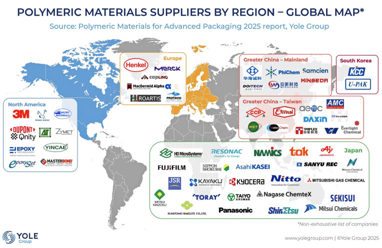 Rynek zaawansowanych opakowań polimerowych jest jednocześnie zróżnicowany i skoncentrowany. Pięciu największych graczy – Resonac, Henkel, Panasonic, Sumitomo i HD Microsystems – odpowiada za ponad 50% globalnych przychodów. I dzięki firmom Resonac, Panasonic, Sumitomo i HD Microsystems na rynku dominuje Japonia, obejmując ok. 80% całkowitych przychodów. Za Japonią są Niemcy z ok. 10% udziału rynkowego dzięki Henkelowi, natomiast Stany Zjednoczone i Chiny zdobywają po około 5%, odpowiednio dzięki firmom 3M i DuPont/Qnity oraz Huahai Chengke i Samcien.