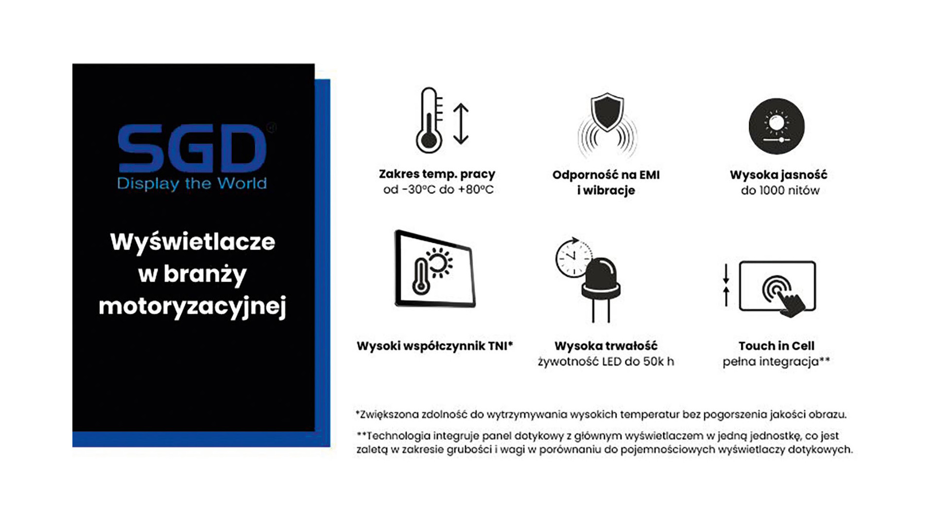 Ciekawą grupą wyświetlaczy producenta SGD są wyświetlacze LCD-TFT przeznaczone do zastosowań motoryzacyjnych. Produkty motoryzacyjne muszą spełniać rygorystyczne wymagania, aby sprostać warunkom użytkowania na zewnątrz. Produkty te zazwyczaj muszą być zgodne ze specyfikacjami, takimi jak szeroki zakres temperatur, duża jasność, długa trwałość, odporność na promieniowanie UV i wibracje itp. Wyświetlacze LCD-TFT dla branży motoryzacyjnej firmy SGD są zaprojektowane z myślą o takich specyfikacjach.