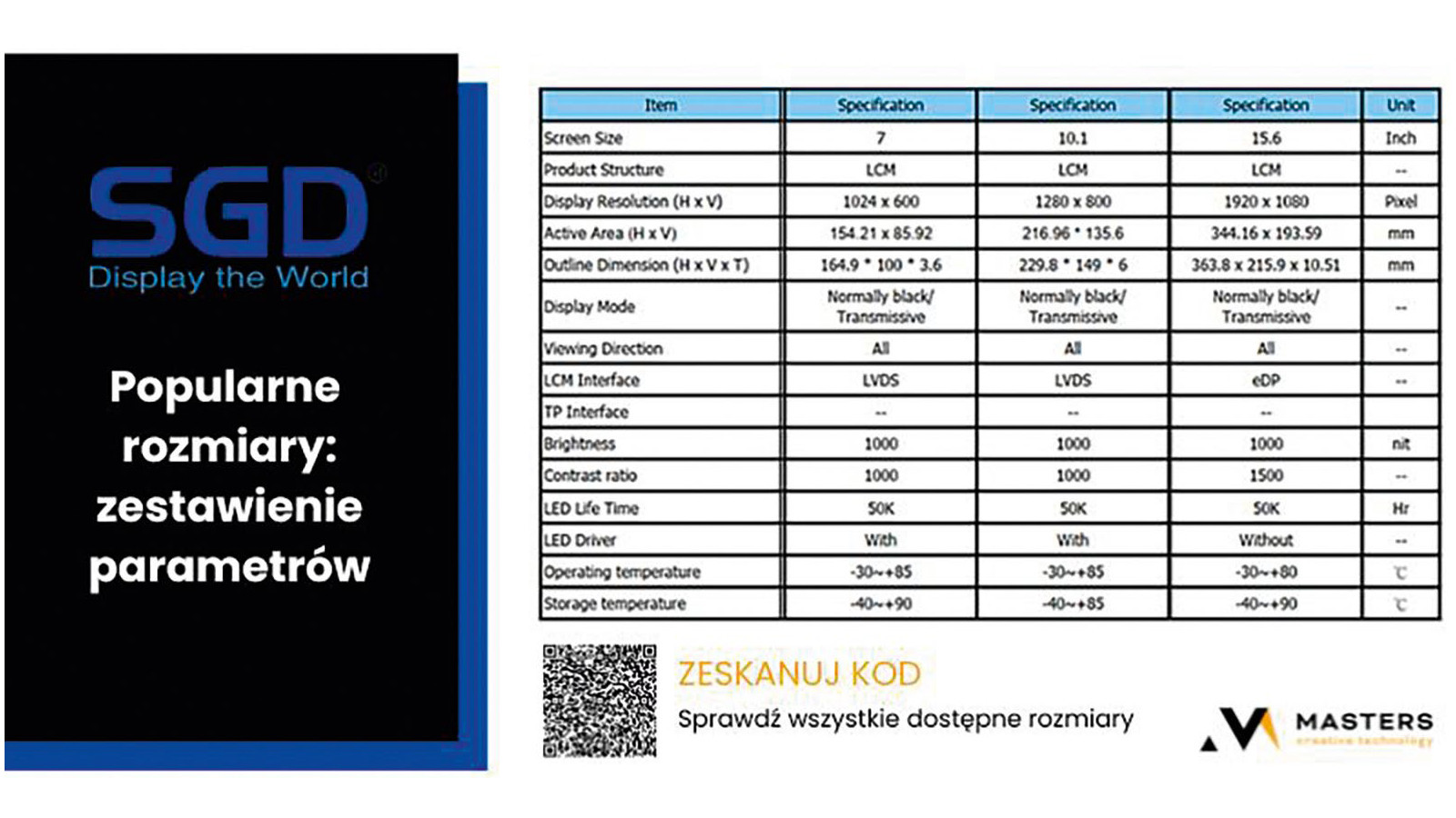 Tajwańska firma Solomon Goldentek Display Corporation (SGD) została założona w 1990 roku i utrzymuje się na szczycie branży wyświetlaczy. SGD nie tylko produkuje wyświetlacze, takie jak TN, STN, TFT, ale także świadczy profesjonalne usługi w zakresie badań i rozwoju, produkcji oraz sprzedaży. Masters jest oficjalnym dystrybutorem wyświetlaczy marki SGD w Polsce.