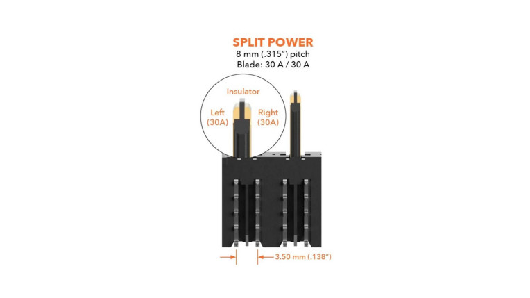 Nowe rozwiązanie Split Power (30/30 A) wchodzące w skład rodziny produktów PowerStrip EXTreme Ten60Power firmy Samtec "dzieli" obciążalność 60 A charakterystyczną dla ET60T/ET60S, na dwie części, tj. w podziale 30/30 A na pin rozdzielony izolatorem. Pozwala to na zwiększenie liczby styków w złączu bez problemów związanych z odprowadzaniem ciepła.