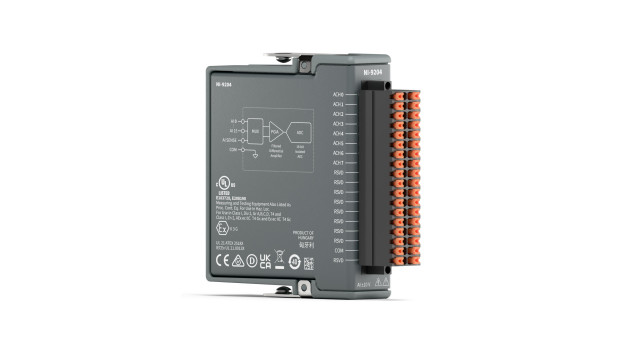 NI 9204 to moduł wejść analogowych o 16-bitowej rozdzielczości, przeznaczony do pracy w szerokim zakresie temperatury otoczenia od -40 do +70°C. Oferuje maksymalną szybkość próbkowania 250 KSps. Może być skonfigurowany do pracy w trybie 16 wejść asymetrycznych lub 8 wejść różnicowych ze sprzężeniem stałoprądowym, a jego wewnętrzny wzmacniacz pomiarowy udostępnia 4 zakresy napięcia wejściowego: ±10 V, ±5 V, ±1 V i ±0,2 V.