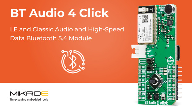 Płyta BT Audio 4 Click firmy Mikroe została zaprojektowana do realizacji bezprzewodowej transmisji audio i danych w standardzie Bluetooth w trybie klasycznym i LE Audio. Jej podstawowym elementem jest moduł IDC777-1 produkcji IOT747, zgodny ze specyfikacją Bluetooth 5.4, obsługujący tryby LE Audio Unicast oraz Auracast z wykorzystaniem kodeka LC3. Sterowanie i transmisja danych odbywają się przez interfejs UART.