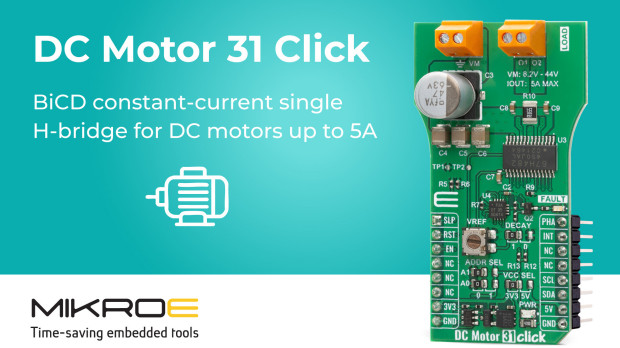DC Motor 31 Click to moduł przeznaczony do sterowania silnikami DC z komutatorem szczotkowym, zawierający wyjście mostkowe o wydajności prądowej 2 A. Został oparty na sterowniku TB67H482FNG firmy Toshiba. Obsługuje szeroki zakres napięć sterujących silnikiem od 8,2 V do 44 V. Sterowanie odbywa się w trybie PWM z regulacją prądu, co pozwala utrzymać stabilne parametry pracy silnika w zmiennych warunkach obciążenia.