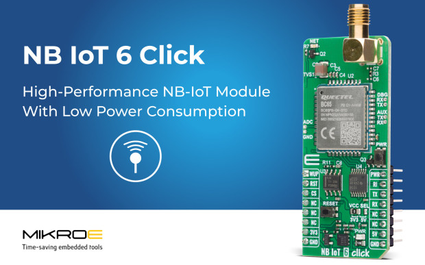 NB IoT 6 Click to moduł rozszerzający, przeznaczony do integracji w systemach embedded, wymagających komunikacji w technologii NB-IoT. Został oparty na module Quectel BC65, obsługującym transmisję w standardach LTE NB-IoT, zgodnych ze specyfikacjami 3GPP Release 13 i Release 14. Może pracować w szerokim zakresie częstotliwości od 700 MHz do 2,2 GHz, obsługując pasma LTE B1, B3, B5, B8, B20 oraz B28. Duża moc nadawania (23 dBm ±2 dB) i czułość odbiornika (-114 dBm), zapewniają długi zasięg transmisji przy bardzo dobrej stabilności połączenia i małym poborze mocy.