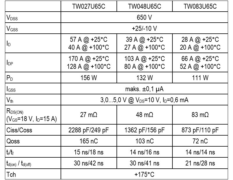 TW027U65C, TW048U65C i TW083U65C mogą pracować z napięciem bramki od -10 do +25 V, co upraszcza obwód sterujący. Ich napięcie progowe Vth zawiera się w przedziale od 3,0 do 5,0 V, rezystancja RDS(ON) wynosi odpowiednio 27 mΩ, 48 mΩ i 83 mΩ, a maksymalny ciągły prąd drenu to 57 A, 39 A i 28 A w temperaturze +25°C.