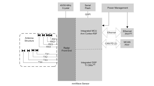 AWR2944P wspiera konfiguracje z 4 nadajnikami i 4 odbiornikami, co pozwala na realizowanie rozbudowanych funkcji radarowych, np. pomiarów w przestrzeni 3D i klasyfikacji obiektów. Duży stopień integracji ogranicza liczbę elementów współpracujących i stopień złożoności sekcji w.cz.