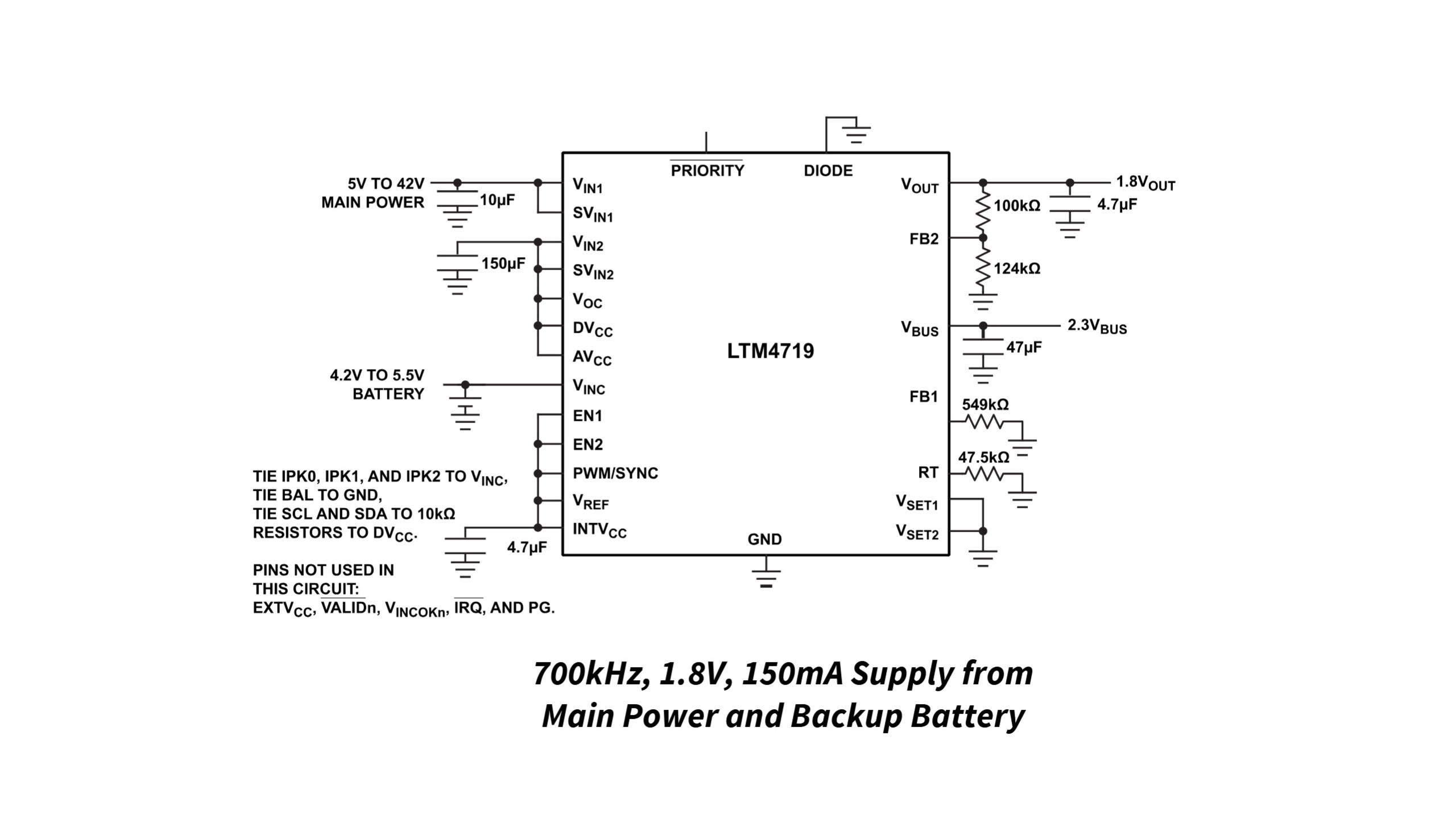 LTM4719 umożliwia stabilizowanie napięcia wyjściowego w zakresie od 1 V do 4,2 V, zapewniając wydajność prądową 150 mA. Zawiera wbudowany regulator LDO, którego napięcie dropout wynosi zaledwie 195 mV przy pełnym obciążeniu. Pobór prądu układu wynosi typowo 560 nA w stanie spoczynkowym i 42 µA przy pełnym obciążeniu, co pozwala na efektywne wykorzystanie energii w systemach zasilanych bateryjnie. W trybie Burst, pobór prądu spoczynkowego jest ograniczany do 18,5 μA.