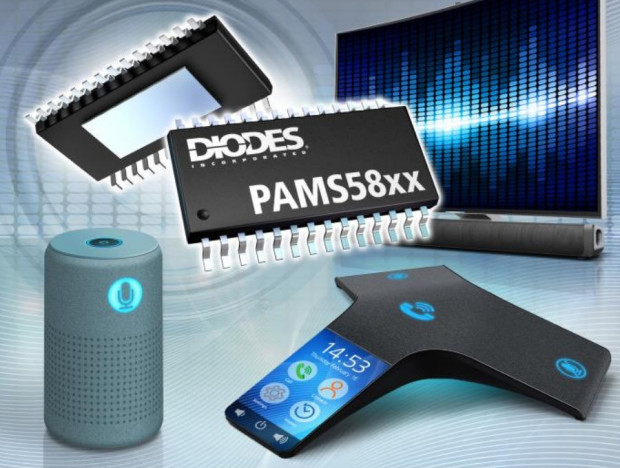Firma Diodes wprowadza do sprzedaży nową rodzinę stereofonicznych wzmacniaczy audio klasy D z wejściem cyfrowym i zamkniętą pętlą sprzężenia zwrotnego. W ramach rodziny PAMS58xx dostępnych jest 5 układów: PAMS5803, PAMS5804, PAMS5825, PAMS5826 i PAMS5827, różniących się mocą znamionową, zakresem napięcia zasilania, sprawnością i wyjściowym napięciem szumu. Wszystkie zawierają szeregowy interfejs wejściowy i wyjście SDOUT, przeznaczone do monitorowania sygnału i realizacji algorytmów redukcji echa. Pracują z podwójnym napięciem zasilania: PVDD o zakresie od 4,5 do 26,4 V i DVDD, wynoszącym 3,3 V lub 1,8 V w zależności od konfiguracji systemu. Przy zastosowaniu jedynie kilku elementów pasywnych, możliwe jest uzyskanie mocy wyjściowej od 24 W do 41 W na kanał w trybie stereo lub od 40 W do 82 W w trybie mono.