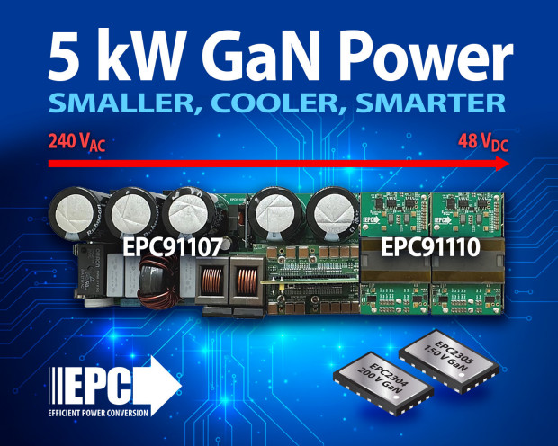 Firma Efficient Power Conversion zaprezentowała projekt referencyjny systemu zasilania o mocy 5 kW do serwerów AI i centrów danych. Został on oparty wyłącznie na tranzystorach mocy GaN i składa się z dwóch bloków: stopnia wejściowego PFC (EPC91107KIT) oraz izolowanego konwertera DC/DC (EPC91110KIT). System realizuje konwersję napięcia sieciowego 240 VAC do napięcia magistrali pośredniej 400 VDC, a następnie do napięcia wyjściowego 50 VDC, wykorzystywanego w systemach serwerowych i szafach zasilających, zgodnych z wymogami Open Compute Project ORv3. Zapewnia sprawność energetyczną sięgającą 96,5% i gęstość mocy 7,08 W/cm³.