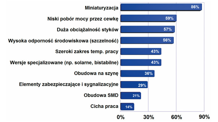 Trzy kryteria wyraźnie wybijają się ponad resztę w zestawieniu najważniejszych cech ofert handlowych w zakresie przekaźników elektromagnetycznych: cena oraz jakość i niezawodność. Nieco mniejsze wskazanie, ale nadal bardzo duże mają marka producenta oraz krótki termin dostawy. Cena i jakość i cena zawsze plasują się na górnych pozycjach tego typu zestawień, stąd też wykres nie zaskakuje. Dwa lata temu termin dostawy był o oczko wyżej, bo był to wówczas ważny problem dla branży, teraz następuje normalizacja. Zainteresowanie jakością to efekt zmian w całej technice w ostatnich dwóch dekadach, podobnie jak marka oraz kompetencje dostawcy. Jeśli dany producent istnieje na rynku od wielu lat, ma kompetentnych dystrybutorów, jego marka jest znana i ma pewną renomę na rynku, wówczas klienci przychylniej oceniają takie produkty.