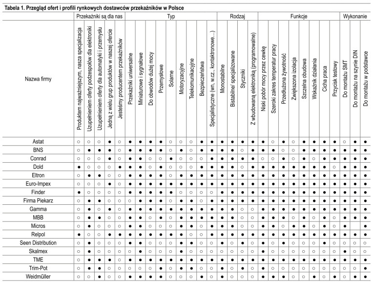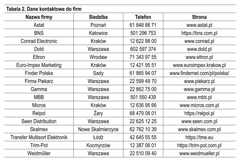 Przegląd ofert dostawców związanych z przekaźnikami elektromagnetycznymi pokazujemy w tabeli 1. Informacje tam zawarte przybliżają podstawowe dane o dostawcach, takie jak wielkość firmy oraz stopień zaangażowania w omawianej tematyce, a dalej listę dostępnych typów oraz funkcjonalności, które można uznać za specyficzne dla popularnych aplikacji. W tabeli 2 zamieszczamy dane kontaktowe do firm.