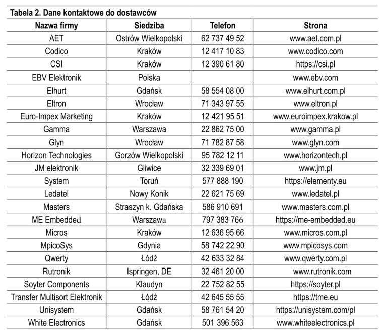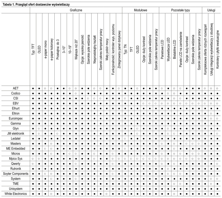 Przegląd ofert dostawców prezentujemy w tabeli 1, która zawiera główne informacje na temat tego, czy dany produkt jest w ofercie czy go nie ma. Kolumny dzielą tabelę na poszczególne typy, a ostatnie pola są przeglądem usług związanych z wyświetlaczami. W tabeli 2 podane zostały dane adresowe do poszczególnych firm.
