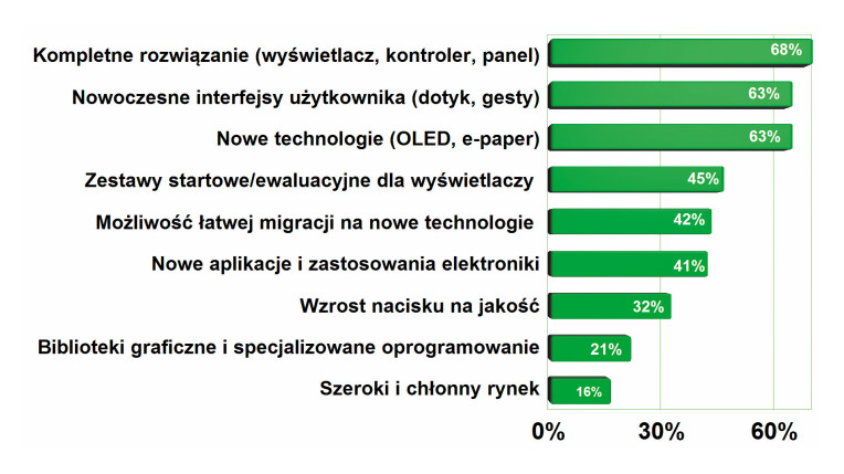 Za najbardziej istotny czynnik sprzyjający rozwojowi rynku wyświetlaczy uznano dostępność kompletnych zintegrowanych jednostek zawierających panel dotykowy, wyświetlacz oraz kontroler zarządzający całością. Taki moduł łatwo można połączyć z aplikacją, a dodatkowo jest to rozwiązanie gotowe, które uwalnia od trudnych operacji łączenia wrażliwych elementów. Jest to też rozwiązanie wymagające niewielkiego nakładu pracy ze strony projektanta. Kolejne zjawiska pozytywnie wspierające rynek to duża popularność nowoczesnych interfejsów użytkownika, a także coraz większa penetracja nowych technologii wyświetlaczy na rynku (tj. OLED i e-paper).