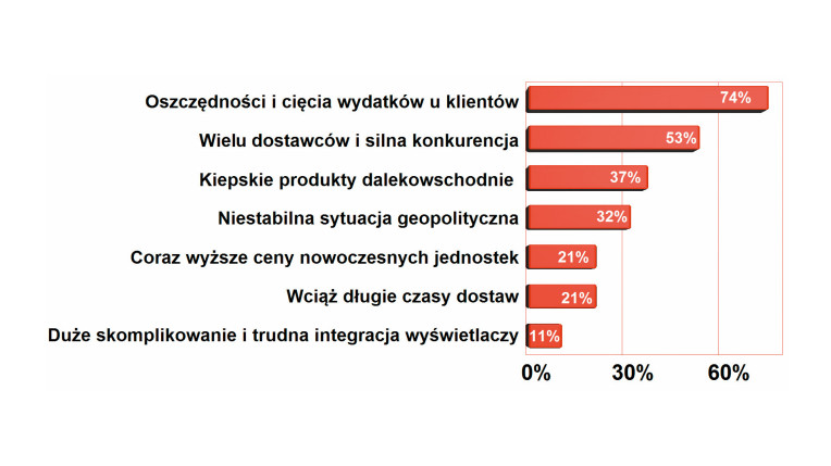 Oszczędności i cięcia wydatków wywołane słabszym popytem rynku, silna konkurencja od wielu dostawców, w tym również firm chińskich i kiepskie produkty azjatyckie zawsze stanowią trzon problemów, z którymi zmaga się rynek dystrybucji. Niestabilna sytuacja geopolityczna wskazana została jako potencjalny problem dla rynku przez co trzecią ankietowaną firmę, a kryją się za nią problemy z logistyką oraz wahania popytu. Każda niestabilność jest problemem dla rynku, gdyż przenosi się ona na decyzje inwestycyjne klientów.