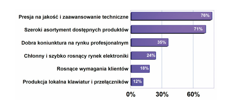 Listę najważniejszych czynników pozytywnie wspierających rynek otwiera presja na jakość oraz zaawansowanie techniczne. Jakość jest pojęciem, o którym się obecnie wiele mówi i przykłada do niego dużą wagę. Kolejne miejsce z minimalnie mniejszym udziałem to szeroki asortyment dostępnych produktów, pozwalający dobrać element przełączający bez konieczności kompromisu oraz dobra koniunktura na rynku profesjonalnym (wojsko, lotnictwo, motoryzacja). To trzecie kryterium jest już zdecydowanie słabiej zarysowane w porównaniu do wymienionych poprzednich dwóch.