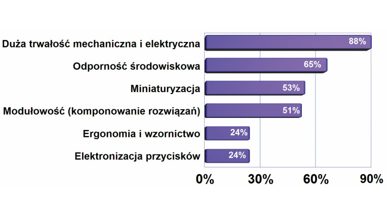 Za najważniejsze trendy techniczne uznano dużą trwałość mechaniczną i elektryczną elementów przełączających, a w dalszej kolejności odporność środowiskową, a więc mówiąc ogólnie, zagadnienia związane z jakością. Na trzecim miejscu wypadła miniaturyzacja, która jest zjawiskiem zmieniającym całą współczesną technikę. Duża odporność środowiskowa także wiąże się z jakością i wskazuje, że rynek szybko dojrzewa, a wybory klientów są coraz bardziej świadome. Na koniec warto odnotować, że modułowość w przełącznikach, a więc możliwość komponowanie produktu przez wybór części składowych, takich jak klawisz, kolor, podświetlenie, stale zyskuje na znaczeniu. Jest to już czwarta pozycja na wykresie.