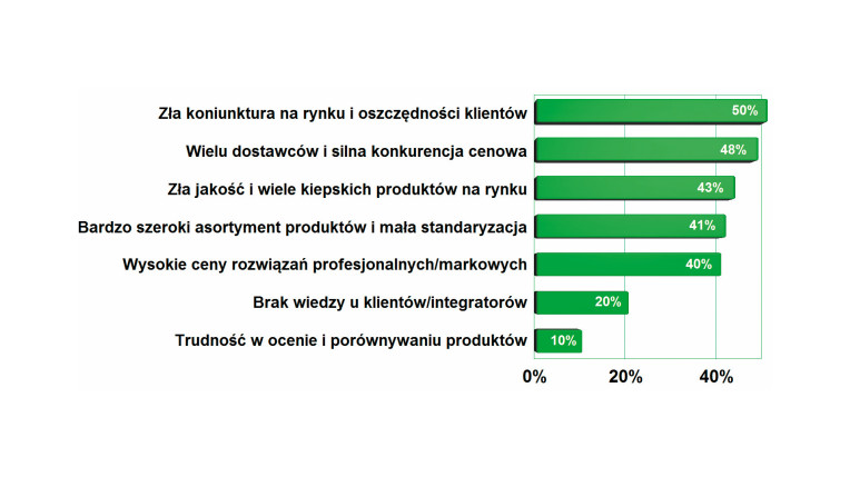 Za najbardziej istotne czynniki negatywne dla rynku oświetlenia uznano słabą koniunkturę na rynku i oszczędności w inwestycjach, które istotnie degradują tempo rozwoju. Za minimalnie słabiej zarysowane kryterium uznano dużą konkurencję na rynku, wielu dostawców aktywnych w tej tematyce. Niewiele słabsze wskazania padły również na to, że problemy tworzą wyroby o złej jakości, można przypuszczać, że w sumie chodzi o importerów najtańszych wyrobów z Azji, którzy konkurują wyłącznie ceną. Kolejny istotny czynnik to bardzo szeroki asortyment produktowy i mała standaryzacja, które ograniczają dostawcom potencjał budowania lokalnych magazynów po to, aby zapewnić oczekiwaną przez rynek szybkość dostaw.