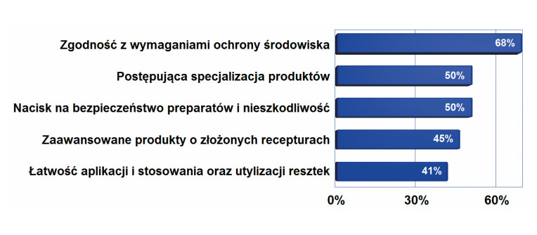 Za najważniejsze zagadnienie techniczne w preparatach chemicznych uznawana jest zgodność z wymaganiami w zakresie ochrony środowiska. Kupujący oczekują, że materiały chemiczne nie będą ich truć lotnymi związkami organicznymi ani tworzyć szkodliwych dla oddychania par, wymagać kosztownej utylizacji ani też oddziaływać negatywnie na produkty niszcząc ich powłoki ochronne lub pozostawiając resztki. Ta zgodność środowiskowa wiąże się też z szeroko rozumianym bezpieczeństwem materiałów i preparatów. Trend ten widzimy w tym, że preparaty bazujące na wodzie jako rozpuszczalniku zawsze pozostają w centrum uwagi oraz specjalistyczne rozwiązania, które zapewniają szybki proces aplikacji, są długo ważne po otwarciu itd. Trzecia pozycja na wykresie ma także charakter użytkowy związany z wygodą i łatwością aplikacji oraz utylizacji resztek.