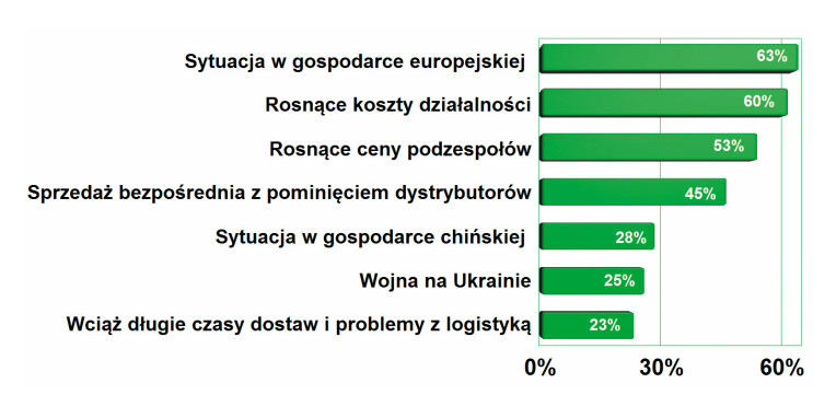 Największym problemem dla rynku dystrybucji jest nienajlepsza sytuacja w gospodarce europejskiej, a w dalszej kolejności rosnące koszty działalności, tj. materiałów, pracy i energii. Wpływ wojny na Ukrainie, warunków na rynku w Chinach, nie zostały w tym obszarze biznesu wskazane jako bardzo ważne. Nie ma też problemu z czasem dostaw i globalną logistyką towarów, za to wysoko na wykresie uplasowały się rosnące ceny podzespołów. Drożejące komponenty zaostrzają konkurencję na rynku między dystrybutorami oraz otwierają drzwi dla firm brokerskich z Azji i dla kontraktów z pominięciem rynku dystrybucji (np. bezpośrednio od producenta). Większość czynników wymienionych na wykresie ma charakter systemowy i dotyczy wszystkich branż. Powtarzają się przy każdej grupie produktów omawianych w naszych analizach.