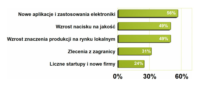 Za najważniejszy dla rozwoju rynku EMS czynnik pozytywny wymieniono w ankietach nowe zastosowania elektroniki i aplikacje. Chodzi o to, że coraz więcej firm i branży sięga po rozwiązania elektroniczne, mimo że pierwotna ich działalność nie była związana z elektroniką. Elektronizacja dotyczy bardzo wielu dziedzin techniki, urządzeń i systemów, a rozwiązania mechaniczne są sukcesywnie zastępowane przez te bazujące na prądzie. Elektronika jest też źródłem nowej funkcjonalności i rozwoju, stąd branża EMS upatruje rozwoju w pracy na rzecz firm, których warunki panujące na rynku i dziejące się zmiany zmuszają do sięgnięcia po rozwiązania elektroniczne, nawet jeśli się na tym kompletnie nie znają. W drugiej kolejności rozwojowi sprzyja zainteresowanie utrzymaniem wysokiej jakości. Bardzo wysoko oceniono także znaczenie zleceń płynących z rynku lokalnego.