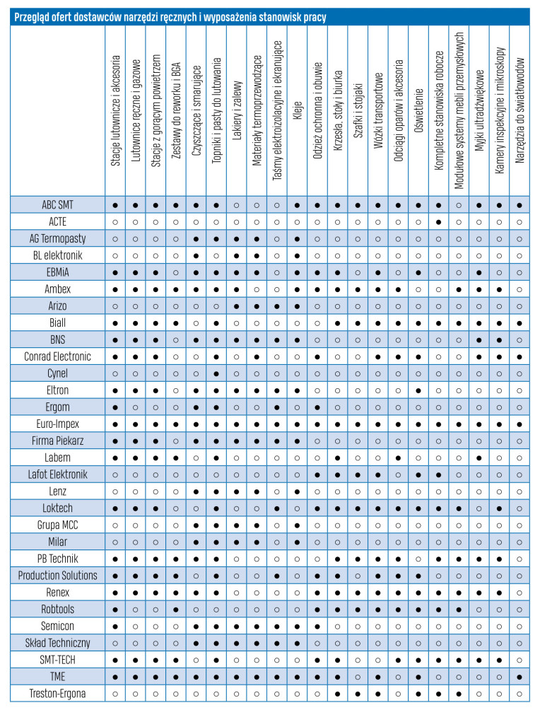 Najważniejszą grupę produktów do omawianych zadań tworzy sprzęt lutowniczy, w tym lutownice, stacje lutownicze i na gorące powietrze oraz stanowiska do reworku, czyli do napraw w trakcie produkcji. Kolejna grupa to wyposażenie stanowisk pracy w serwisie, laboratoriach, utrzymaniu ruchu, produkcji. W tym obszarze mieści się odzież antystatyczna i środki ochrony osobistej (rękawiczki, obuwie) oraz meble warsztatowe, biurka (stanowiska robocze), oświetlenie, wyciągi, sprzęt do magazynowania komponentów i podobne produkty, jakie są konieczne, aby po prostu wygodnie i efektywnie pracować. Ostatnia grupa produktów to narzędzia ręczne, których oferta szybko się poszerza, nie tylko w zakresie szczypiec i śrubokrętów, ale także w obszarze sprzętu do inspekcji, mycia, manipulowania. Podobnie jest w narzędziach do obróbki złączy: do zaciskania, obrabiania końcówek, przygotowywania kabli itp. Takiego sprzętu są dziesiątki, stąd każde hasło wymaga rozwinięcia.