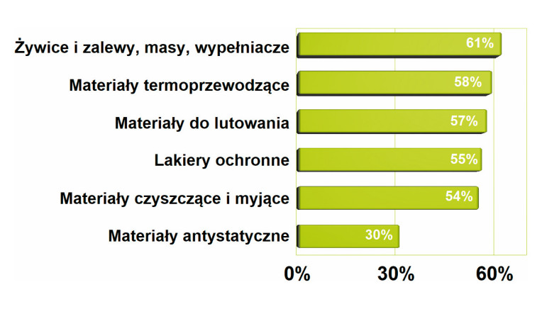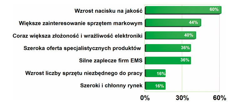 Największy potencjał rynkowy mają urządzenia do lutowania. Na drugiej pozycji uplasowały się materiały i urządzenia związane z ochroną antystatyczną, bo produkty te podlegają zużyciu. Wysokie trzecie miejsce dla mikroskopów i kamer to wynik miniaturyzacji elektroniki, gdyż na płytkach drukowanych jest coraz więcej podzespołów nie większych od łebka szpilki. Stosunkowo wysoko oceniono potencjał odzieży ochronnej oraz sprzętu do napraw PCB. Ten pierwszy zapewne z uwagi na zużycie i nacisk na jakość procesów, ten drugi z uwagi na koszty produkcji.