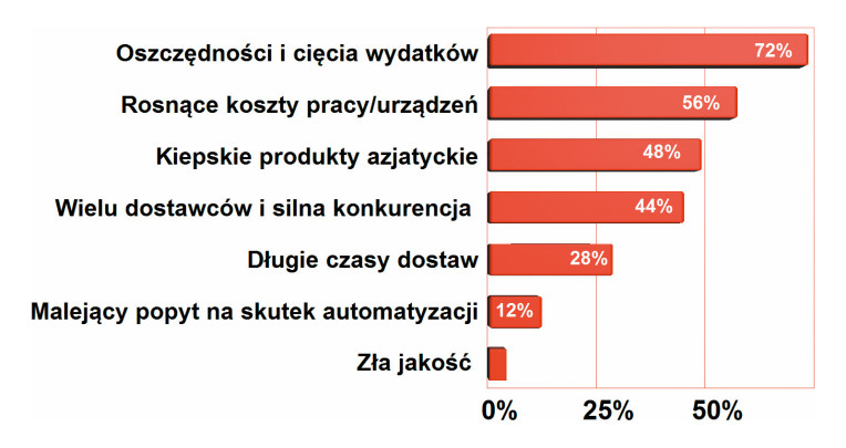 Najważniejsze czynniki negatywnie oddziałujące na rynek wyposażenia warsztatowego wiążą się z obecną sytuacją na rynku, a więc cięciami wydatków i ograniczaniem inwestycji oraz rosnącymi kosztami produktów i materiałów oraz zatrudnienia. Kolejne czynniki są już "systemowe", bo do tej kategorii zaliczyć można dużą konkurencję na rynku wynikającą z obecności wielu dostawców i dyktat niskiej ceny ze strony producentów tanich wyrobów chińskich. Są produkty nietrwałe, niedostatecznie precyzyjne, wykonane z kiepskich materiałów, przez co szybko się zużywają, nie zapewniają pożądanej precyzji i po krótkim czasie muszą być wymienione na nowe. Niemniej z uwagi na koszty nawet produkty czołowych marek mają obecnie problemy z jakością, bo w wielu przypadkach są to faktycznie produkty chińskie odpowiednio ładnie etykietowane.