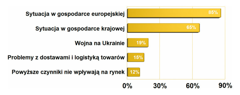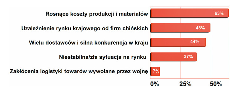 Ranking aktualnie najbardziej dotkliwych problemów dla branży PCB otwiera zła sytuacja w gospodarce europejskiej. To jest spojrzenie w szerszej perspektywie na rynek, ale sytuacja w gospodarce krajowej też nie zachwyca. Celowo rozdzieliliśmy w ankiecie pytanie o panujące warunki na rynku na dwie pozycje, mając świadomość, że gospodarka krajowa jest częścią europejskiej, po to, aby lepiej poznać kontekst. A jest on taki, że to, co dzieje się za granicą, jest większym problemem, bo zlecenia eksportowe na produkcję, usługi i produkty ratowały nasze bilanse i łagodziły mizerię krajowego biznesu w przeszłości.