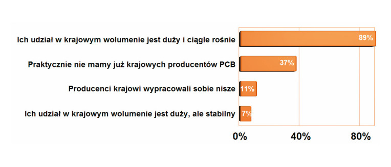 Od wielu lat częścią naszego badania ankietowego w obszarze obwodów drukowanych jest pytanie na temat pozycji krajowych producentów PCB na tle firm chińskich, które konkurują ceną, zaawansowaniem technologii i dostępnością obwodów drukowanych z resztą świata. Nasze zestawienia oceniające te działania przez lata wskazywały, że udziały i potencjał płytek chińskich w Polsce nieustannie rósł. Wprawdzie w okresie pandemii nastąpiło małe wyhamowanie, ale był to jedynie wyjątek potwierdzający ogólną prawidłowość. W tym roku dopisaliśmy, trochę przewrotnie, kryterium, że krajowych producentów już praktycznie nie ma. Zgadza się z tym blisko 40% pytanych, co doskonale ilustruje, jak bardzo potencjał naszej branży został ograniczony.