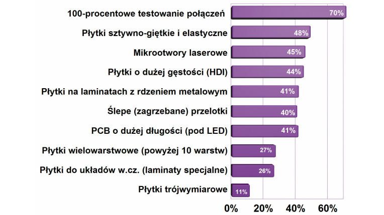 W zestawieniu najważniejszych oczekiwań klientów w zakresie obwodów drukowanych po raz kolejny na pierwszym miejscu znalazło się 100-procentowe testowanie połączeń, a więc pewność wykonania płytek. Jest to bardzo ważny element zapewnienia jakości, bo pozwala skoncentrować się na błędach układowych, a nie domysłach, czy brak działania to jednak nie jest zła płytka. Ponadto kolejne kryteria na wykresie wskazują, że krajowa elektronika szybkimi krokami idzie w kierunku większego zaawansowania technicznego. Płytki sztywno-giętkie, "fleksy", obwody HDI razem z mikrootworami laserowymi i ślepymi przelotkami są dzisiaj potrzebne w wielu projektach elektroniki mobilnej, wojskowej i przemysłowej. Na wykresie widzimy też duże znaczenie zastosowań oświetleniowych dla płytek PCB w Polsce.