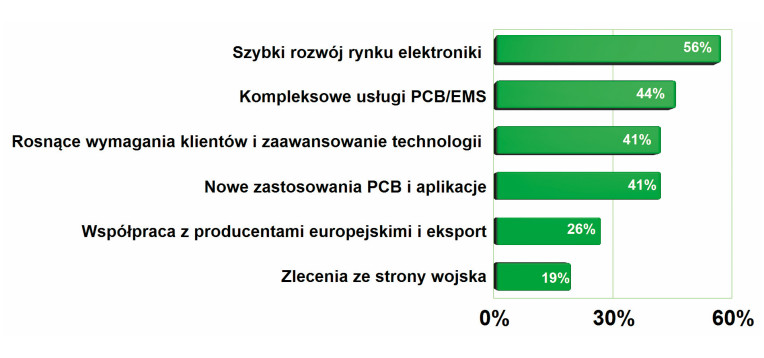 Najważniejszym zjawiskiem pozytywnie oddziałującym na branżę PCB jest szybki rozwój elektroniki, który odpowiada za zwiększającą się chłonność rynku oraz tworzy miejsce dla nowych technologii. Na drugim miejscu w tym zestawieniu znalazły się kompleksowe usługi produkcyjne, dzięki którym wyprodukowanie urządzenia przestało być problemem nawet dla firm, których kompetencje są niewiele związane z elektroniką. Pozytywne oddziaływanie na rozwój rynku mają oczywiście też klienci, których zwiększające się wymagania i potrzeby są naturalnym czynnikiem prorozwojowym.
