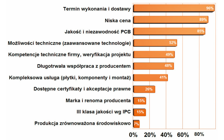 Zestawienie najważniejszych czynników, które biorą pod uwagę klienci, wybierając dostawcę obwodów drukowanych, ma trzy pozycje wyraźnie dominujące nad całą resztą: termin wykonania, cenę i jakość. Nie jest to zaskoczeniem, bo taki potrójny selektor zawsze lokuje się na szczycie wykonywanych przez nas podobnych rankingów. Identycznie było także w poprzednim raporcie poświęconym PCB trzy lata temu, charakterystyczne jest jednak to, że cena jest wyraźnie mniej ważna od terminu dostawy i to w obecnych trudnych czasach. Poza wymienionymi aspektami liczą się możliwości techniczne dostawcy, jego kompetencje techniczne i długotrwała współpraca. Dopasowanie się z projektem do parametrów produkcyjnych, informacja zwrotna do klienta o potencjalnych problemach, dograne kanały wymiany informacji i formaty plików oszczędzają czas i zmniejszają ryzyko pomyłek, stąd zatem wynika ich spore znaczenie.