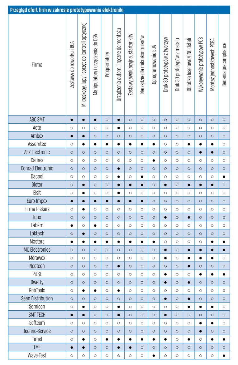 Firm związanych z tematyką prototypowania i produkcji małoseryjnej jest dość dużo, a rynek produktów usług jest bardzo szeroki, gdyż tak sformułowany temat jest podzbiorem dla szerszego kryterium, czyli produkcji elektroniki w ogólności. Stąd w naszym zestawieniu są duże firmy dystrybucyjne o szerokiej ofercie produktowej, jak TME, Masters, Conrad, które sprzedają narzędzia ręczne, stacje lutownicze itp., i zarazem dostawcy oprogramowania projektowego i narzędzi do prototypowania, jak Cadrex. Kolejna grupa charakterystyczna to dostawcy urządzeń do produkcji elektroniki i materiałów, tacy jak SMT- TECH, Loktech, Labem, Robtools. Firmy te mają szerokie oferty sprzętu różnej klasy i o różnym przeznaczeniu, w tym często rozwiązania specjalnie ukierunkowane na produkcję małoseryjną, jak np. urządzenia półautomatyczne wspomagające pracę ręczną lub combo (dwa w jednym).