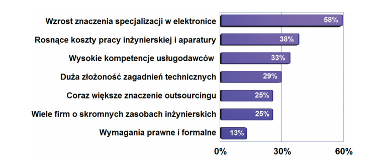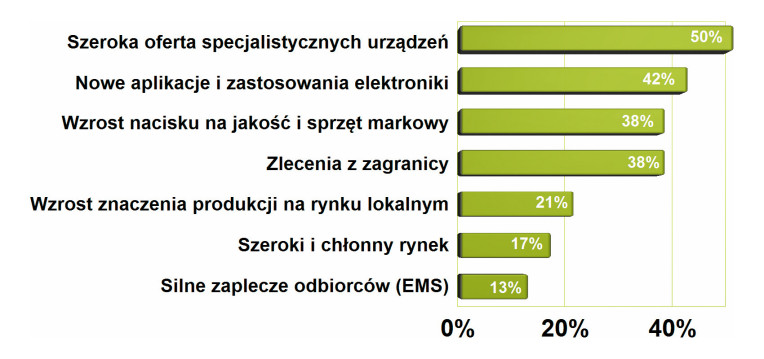 Za najbardziej istotne czynniki sprzyjające rozwojowi rynku produktów i usług niezbędnych do prowadzenia prac prototypowych uznano szeroką ofertę specjalistycznych urządzeń, a w drugiej kolejności nowe aplikacje i zastosowania elektroniki. Nowe aplikacje często wymuszają inwestycje w rozwój parku maszynowego i technologii produkcji, bo niosą ze sobą wzrost miniaturyzacji, nietypowe wymagania, zastosowania lub też konieczność spełnienia norm branżowych. Trzecie miejsce to cały czas rosnące znaczenie wysokiej jakości w procesach wytwórczych. Na kolejnych miejscach uplasowano dostępność zleceń z zagranicy dla krajowych firm, a także dużą liczbę firm EMS, które tworzą wymierny popyt.