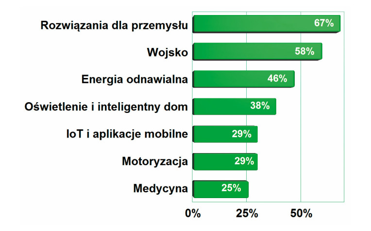 Za najbardziej perspektywiczne obszary aplikacyjne związane z urządzeniami i narzędziami do prototypowania elektroniki uznano rozwiązania dla przemysłu, wojska, aplikacje energii odnawialnej, oświetleniowe i systemy inteligentnego domu. W porównaniu z naszymi wcześniejszymi analizami widoczny jest duży awans w tym zestawieniu rozwiązań wojskowych, które przez wiele lat plasowały się na dole, a teraz wskoczyły na drugie miejsce. To pokłosie wojny.