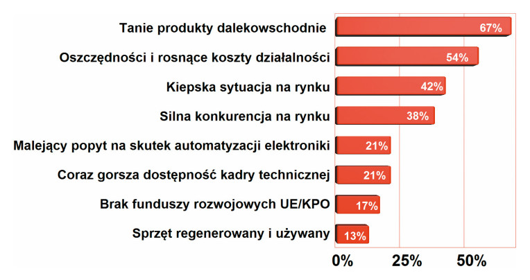 Tym razem za najważniejszy czynnik negatywnie wpływający na rozwój rynku w naszej ankiecie uznano konkurencję ze strony tanich produktów dalekowschodnich, które utrudniają rozwój sprzedaży produktów markowych i często są nietrwałe, niedostatecznie precyzyjne, wykonane ze słabych materiałów, przez co szybko się zużywają. Wiele narzędzi, sprzętu lutowniczego i podobnych produktów sprzedawanych jest na chińskich internetowych platformach handlowych, na których koszty wysyłki są dofinansowywane przez chińskie władze. Efekt jest taki, że dotacje tworzą nierównowagę po stronie konkurencji, tj. niższe ceny przy jednoczesnym braku odpowiedzialności za produkt. Kolejne miejsca przypadły czynnikom wiążącym się z obecną sytuacją na rynku, a więc oszczędnościami i cięciami kosztów po stronie klientów i rosnącymi kosztami materiałów oraz pracy po stronie dostawców.