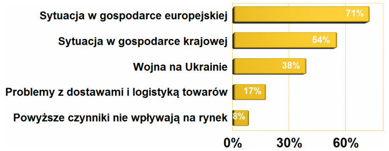 Główne problemy rynku Główne problemy rynku to nie najlepsza sytuacja w gospodarce europejskiej (w szerszej skali) i krajowej, a także wojna na Ukrainie, która psuje nastroje biznesowe i ogranicza inwestycje. Te trzy czynniki są ze sobą silnie powiązane i ich odziaływanie oznacza mniejszy popyt, większe ryzyko biznesowe i koszty. Niepewność co do jutra wpływa też na zachowawcze decyzje takich firm, które wprawdzie mają środki na rozwój, ale nie inwestują z uwagi na niepewność. Ogólnie można powiedzieć, że czynniki geopolityczne ciążą na rynku, a widmo kolejnej wojny za kilka lat ogranicza poziom inwestycji zagranicznych w Polsce oraz mocno skupia rozwój na sektorach strategicznych dla bezpieczeństwa kraju – wojsko, energia, koleje.