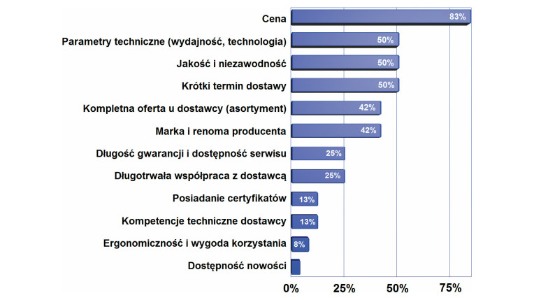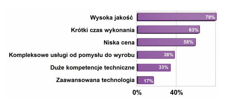 Klienci zawsze są zainteresowani najlepszym połączeniem kluczowych kryteriów, takich jak wysoka jakość, niska cena oraz krótkim czasem realizacji usług lub dostawy, a w dalszej kolejności możliwością kompleksowej usługi w jednej firmie i wysokimi kompetencjami dostawcy i usługodawcy. Układ ten i kolejność słupków na wykresie są niezmienne od lat, a wartości procentowe dla poszczególnych kryteriów podlegają jedynie niewielkim fluktuacjom.