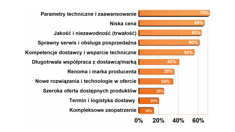 W przypadku omawianego sprzętu w selekcji dostawców istotne są kryteria charakteryzujące dojrzałe rynki, a więc jakość i parametry, serwis techniczny i kompetencje techniczne dostawcy. Cena w tym zestawieniu pojawia się na drugim miejscu, tj. dość wysoko w porównaniu do naszych poprzednich badań ankietowych. Dwa lata temu cena uplasowała się dopiero na siódmej pozycji od góry, natomiast termin dostawy był na pozycji czwartej. Teraz sytuacja „wróciła do normy”, tj. mniej więcej do średniej z ostatnich lat. Oczywiście w praktyce liczy się nie pojedyncze kryterium, ale najlepsze połączenie tych najważniejszych w całość oferty handlowej.