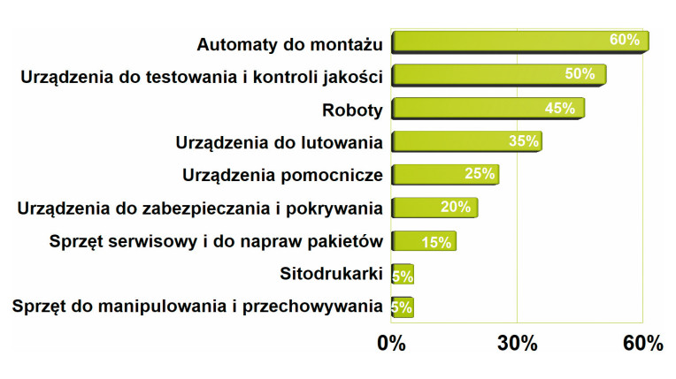 W ostatnich latach liderem zestawienia, w którym pytaliśmy o potencjał biznesowy urządzeń, były roboty. Zaskakująco w tym roku spadły one na trzecią pozycję, a pierwsza przypadła automatom montażowym. Druga pozycja dla urządzeń do kontroli pakietów i testowania jakości, takich jak AOI, SPI, X-ray, nie jest zaskakująca, gdyż w świetle przedstawionych w artykule rozważań to co sprzyja poprawie jakości produkcji, jest dla omawianego sektora istotne. Gorsze wskazania dla robotów mogą być efektem słabszej dostępności, płytkości rynku, a także tego, że roboty to "duża" inwestycja i w czasie dołka mogły wypaść z listy wydatków.