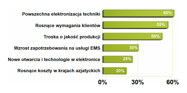 Za zjawiska korzystne dla rozwoju rynku uznano coraz większe znaczenie elektroniki we współczesnej technice oraz intensywną elektronizację branż i produktów, które do niedawna potrafiły się bez niej obyć. Popyt napędzają też rosnące wymagania klientów, którzy przesuwają poprzeczkę wyżej dla dostawców w ślad za kolejnymi zleceniami od klientów, nowymi generacjami produktów i technologią komponentów. Pozytywne znaczenie ma ponadto stały trend poprawy jakości produkcji urządzeń elektronicznych. W warunkach krajowych dla rynku urządzeń technologicznych istotna jest ponadto silna branża EMS, która tworzy główny segment klientów.