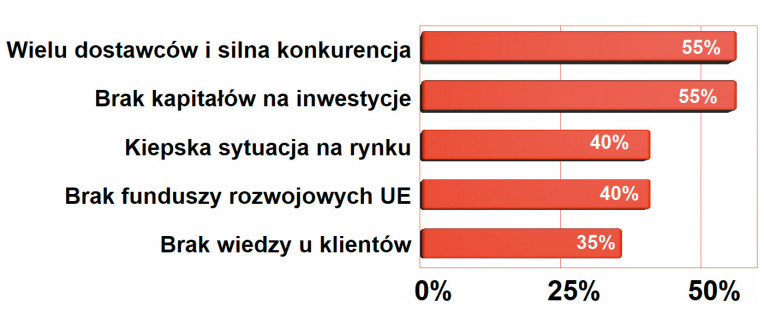 Za najbardziej znaczący czynnik negatywny dla rozwoju rynku uznano dużą konkurencję i działających równolegle obok siebie wielu dostawców urządzeń o nierzadko podobnej funkcjonalności. Nowoczesny sprzęt jest też kosztowny, przez co inwestycje wymagają zdobycia finansowania, wymagają przygotowania biznesplanu, na skutek czego nierzadko rozciągają się mocno w czasie. Z tej przyczyny zapewne brak funduszy rozwojowych UE, w tym KPO został oceniony bardzo wysoko. Aktualnie przeszkadza też kiepska sytuacja na rynku, z rosnącymi kosztami produktów i materiałów oraz zatrudnienia przy jednoczesnym spadku popytu.