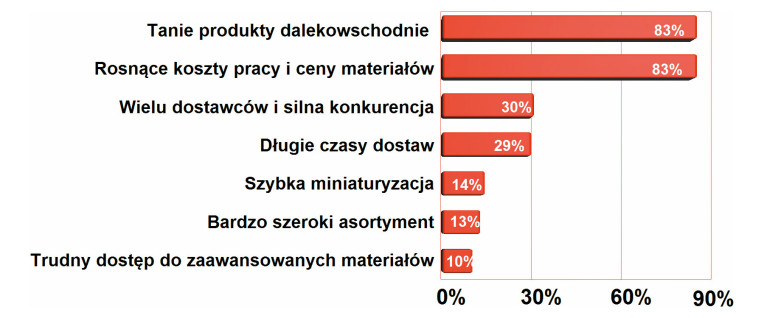 Listę najważniejszych czynników negatywnych dla rozwoju rynku otwierają tanie produkty dalekowschodnie, czyli głównie standardowe dławiki i cewki do układów mocy i filtrów, których niska cena ogranicza możliwość rozwoju rozwiązań zaawansowanych. Tanie wersje standardowe są kłopotem dla firm dystrybucyjnych, natomiast producenci komponentów indukcyjnych zmagają się z rosnącymi kosztami pracy, cenami materiałów oraz zapewne koniecznością stałego inwestowania w maszyny do produkcji. Dla wszystkich problemem jest silna konkurencja, bo omawiany sektor rynku przyciąga coraz to nowych graczy. Długie czasy dostaw nadal są wskazywane jako czynnik negatywnie oddziałujący na rynek, a asortyment omawianych produktów jest na tyle ogromny, że wyklucza możliwość m