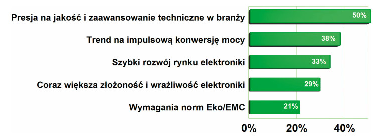 Za najważniejszy czynnik prorozwojowy dla rynku elementów indukcyjnych uznano presję na jakość i zaawansowanie techniczne w branży, co sprzyja popytowi na elementy kastomizowane i projektowane pod aplikację, wykorzystujące nowoczesne materiały magnetyczne i techniki nawijania. Takie wersje stanowią awangardę produktową rynku, są cenniejsze od typowych produktów katalogowych. Znajdująca się na drugim miejscu impulsowa konwersja energii elektrycznej jest standardem i podwaliną wielu nowoczesnych aplikacji, a rozwój tego obszaru techniki jest wprost pochodną dostępności zaawansowanych indukcyjności, stąd jej wysoka pozycja jest naturalna w takim zestawieniu. W dalszej kolejności na wykresie uplasował się szybki rozwój rynku elektroniki i związana z nim większa komplikacja, gęstość upakowania, parametry (wydajność) podzespołów indukcyjnych.