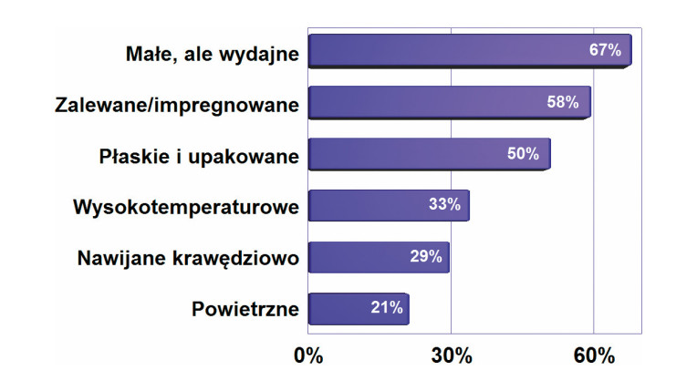 W zakresie elementów indukcyjnych za najbardziej poszukiwane wersje wykonania uznano elementy "małe, ale wydajne", a więc przeznaczone do montażu powierzchniowego, bazujące na nowoczesnych materiałach magnetycznych, które mają dużą indukcję nasycenia i mogą pracować z dużymi prądami roboczymi. Takiego typu dławiki i transformatory przeznaczone są do elektroniki dużej mocy, konwerterów, ładowarek, napędów i podobnych urządzeń, gdzie liczy się duża gęstość mocy. Na drugiej pozycji uplasowały się wersje zalewane i impregnowane, a więc odporne na czynniki środowiskowe, czyli zapewniające poszukiwaną na rynku trwałość. Zalewanie i impregnowanie poprawiają ponadto odprowadzanie ciepła i znakomicie ograniczają emisję akustyczną wywołaną efektem magnetostrykcyjnym oraz drganiem uzwojenia, co jest bardzo istotne w układach oświetleniowych. Trzeci czynnik, płaskie i upakowane, to podzbiór kryterium pierwszego, jeszcze bardziej uwypuklający znaczenie miniaturyzacji.