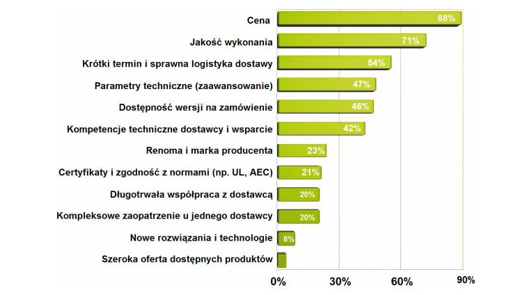 Zestawienie najważniejszych czynników ofert branych pod uwagę przez klientów poszukujących elementów indukcyjnych otwiera oczywiście cena, co jest standardem we wszystkich takich rankingach dotyczących podzespołów elektronicznych. Drugą pozycję na wykresie zajęła jakość wykonania, a trzecią termin dostawy komponentów. Kolejne pola o wskazaniu już poniżej 50% uwypuklają znaczenie wersji na zamówienie, co jest cechą szczególną rynku elementów indukcyjnych i podstawą biznesu dla producentów krajowych, znaczenie długotrwałej współpracy z dostawcą, jego kompetencje techniczne i zapewniane wsparcie techniczne. Za praktycznie nieistotne uznano kryteria takie jak długoletnia współpraca z dostawcą lub możliwość kompleksowego zaopatrzenia w jednym miejscu, co przekonuje, że nie ma dzisiaj miejsca na sentymenty. Może to być też sygnał, że dostawcy wykorzystują stałe relacje i warunki handlowe w ten sposób, że dla nowych klientów są często lepsze.