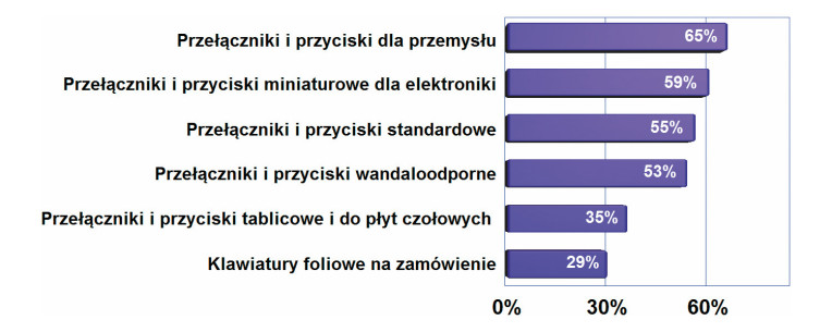 Listę ważnych i poszukiwanych wersji otwierają wersje przemysłowe przełączników, a więc do maszyn, urządzeń, grzybki awaryjne, sterownicze i podobne. W drugiej kolejności są to wersje miniaturowe do urządzeń elektronicznych, tj. głównie montowane na płytkach drukowanych. Niemniej różnice pomiędzy poszczególnymi kategoriami nie są duże i na wykresie nie ma jednej wyraźnie wybijające się nad inne grupy. Popyt jest wyrównany a ilościowo dominują przełączniki i przyciski, co jest zrozumiałe, bo na nie rynek jest wielokrotnie większy niż na klawiatury.
