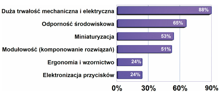 Za najważniejsze trendy techniczne ankietowani uznali dużą trwałość mechaniczną i elektryczną elementów przełączających, a w dalszej kolejności odporność środowiskową, a więc mówiąc ogólnie, zagadnienia związane z jakością. Na trzecim miejscu wypadła miniaturyzacja, która jest zjawiskiem zmieniającym całą współczesną technikę. Duża odporność środowiskowa także wiąże się z jakością i wskazuje, że rynek szybko dojrzewa, a wybory klientów są coraz bardziej świadome. Na koniec warto odnotować, że modułowość w przełącznikach, a więc możliwość komponowanie produktu przez wybór części składowych takich jak klawisz, kolor, podświetlenie, stale zyskuje na znaczeniu. Jest to już czwarta pozycja na wykresie.