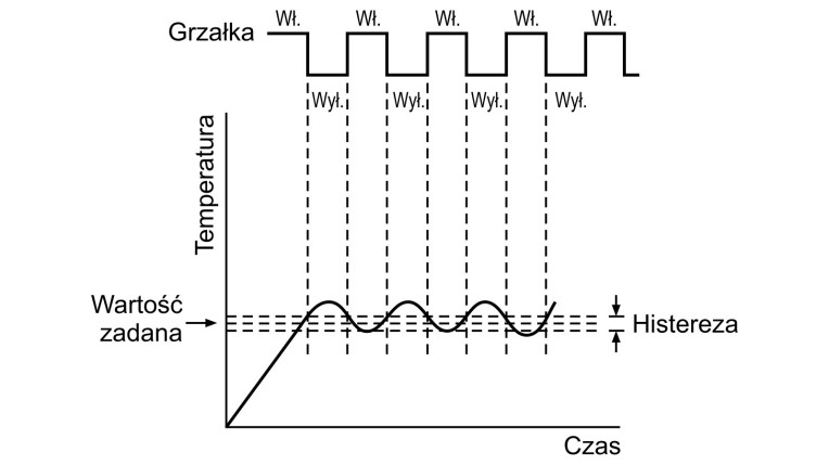 Jeżeli temperatura docelowa jest niższa – grzałka jest włączana, a jeśli wyższa – zostaje wyłączona. Temperatura zmienia się zatem cyklicznie, od wartości poniżej tej zadanej do wartości od niej wyższej i odwrotnie. Jeżeli obiekt sterowania bardzo szybko się nagrzewa i schładza, przełączenia takie są bardzo częste. To z kolei może być niekorzystne dla elementów przełączających i członów wykonawczych. Oprócz tego im szybsza jest reakcja obiektu sterowania, tym można się spodziewać większego przeregulowania i niedoregulowania. By temu zapobiec, wprowadza się histerezę (strefę nieczułości). Jest ona wyrażana jako procent wartości docelowej.
